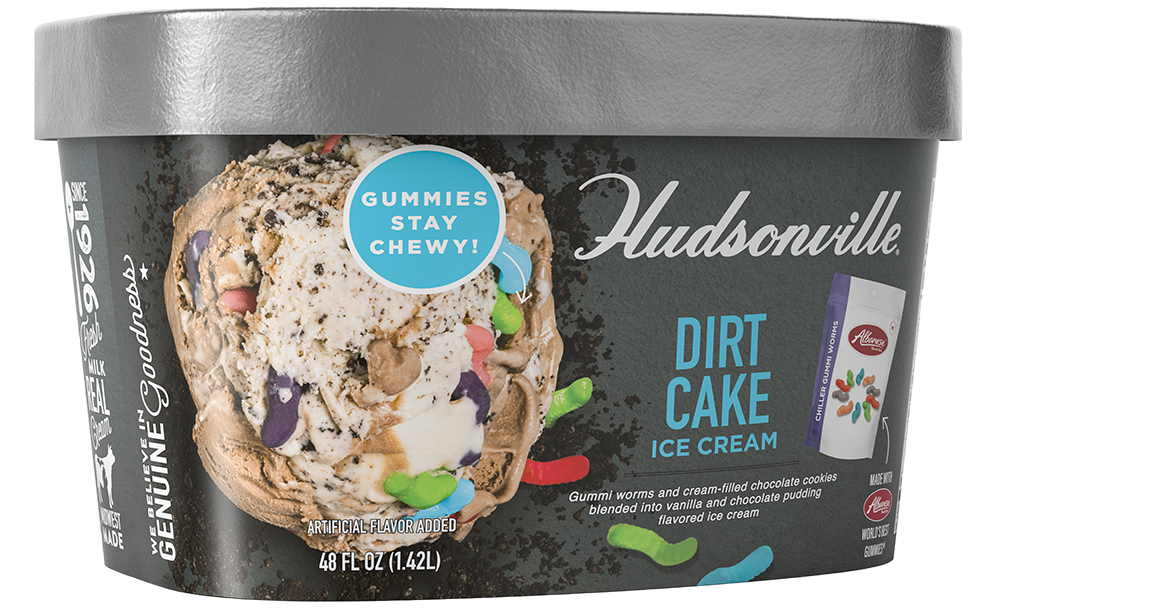 Gummi worms and cream-filled chocolate cookies blended into vanilla and chocolate pudding flavored ice cream