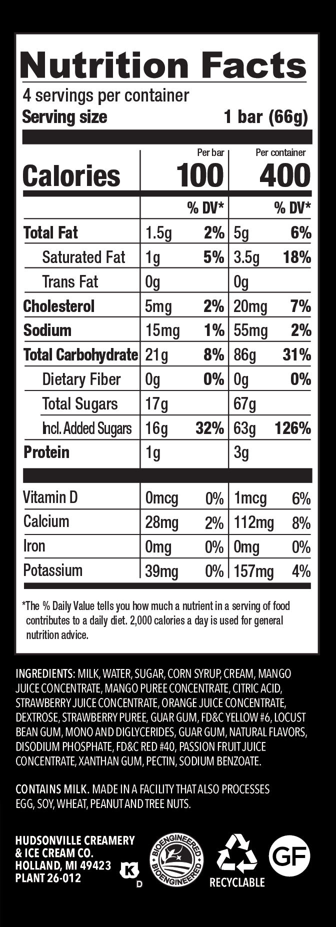 INGREDIENTS: MILK, WATER, SUGAR, CORN SYRUP, CREAM, MANGO JUICE CONCENTRATE, MANGO PUREE CONCENTRATE, CITRIC ACID, STRAWBERRY JUICE CONCENTRATE, ORANGE JUICE CONCENTRATE, DEXTROSE, STRAWBERRY PUREE, GUAR GUM, FD&C YELLOW #6, LOCUST BEAN GUM, MONO AND DIGLYCERIDES, GUAR GUM, NATURAL FLAVORS, DISODIUM PHOSPHATE, FD&C RED #40, PASSION FRUIT JUICE CONCENTRATE, XANTHAM GUM, PECTIN, SODIUM BENZOATE.